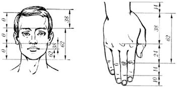 Но не только тело целиком делится, ещё и отдельные части его находятся в зависимости (голова, рука, кисть). Разделив в крайнем и среднем отношении голову человека, увидим, что раздел приходится на линию бровей. При дальнейшем делении образовавшихся частей последовательно получим: кончик носа, кончик подбородка и т.д.